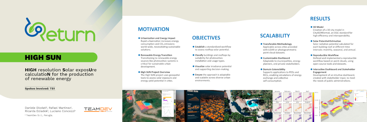 High SUN è un progetto sviluppato all’interno dello Spoke 5.2 dell’Università degli Studi di Napoli Federico II, nell’ambito di RETURN – multi-Risk sciEnce for resilienT commUnities undeR a changiNg climate (https://www.fondazionereturn.it/spoke5/wp-5-2/), finanziato dal PNRR – NextGenerationEU. Il progetto di ricerca utilizza strumenti geospaziali avanzati per valutare in modo preciso l’esposizione solare e il potenziale di produzione energetica da fotovoltaico negli ambienti urbani.